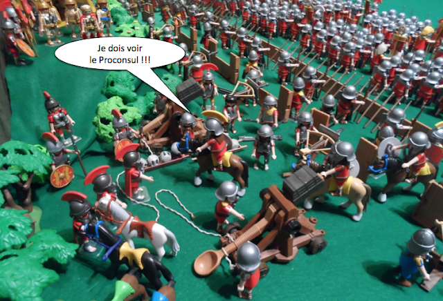 Il s’est positionné avec ses troupes à un endroit qui bloque l’accès à la vallée où se trouvent les camps romains. Il attend maintenant la réponse des chefs gaulois qui se sont révoltés…