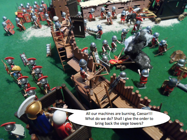 The first attempt is a failure because the Gauls possess powerful war machines that fire flaming arrows and thus burn the siege towers…